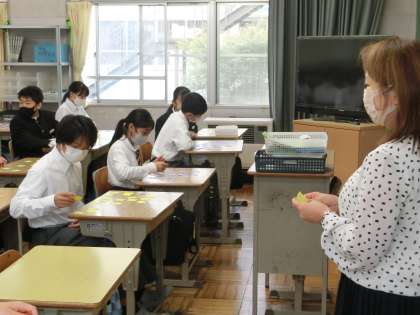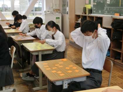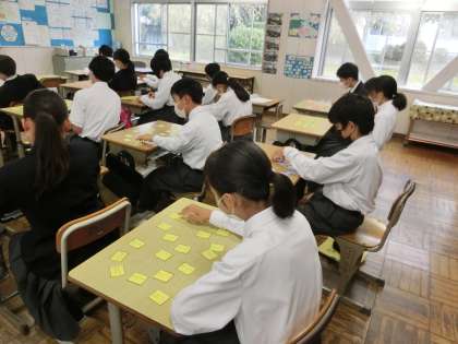 「故事成語」について学んでいました。前回の授業で20問の故事成語を調べ上げ、意味が印刷されたカードに正解を書き込んでいました。今回はそのカードを使って、さらに理解を深めていきます。グループでの対抗戦を前に、まずは個人で直前の復習です。