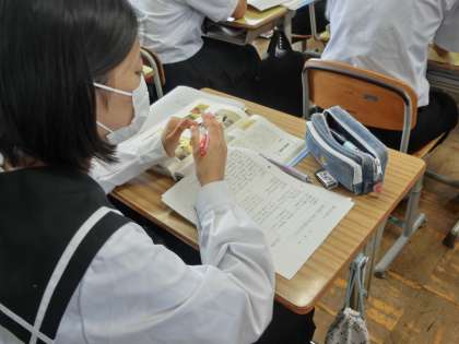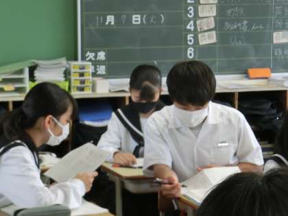 「和歌を音読し、作者の心情や情景をまとめよう」をテーマに学習が進められていました。今回は、係り結びや体言止め、対句や色彩、区切れなどの技法に焦点を当てて、テーマに迫っていきます。終始笑顔が絶えず、仲間の発表後には拍手が沸き起こる温かい雰囲気で授業が進められていました。