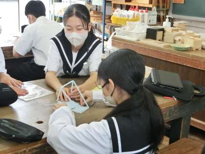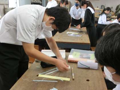 前回、ストローを使っての照明装飾・ヒンメリを作成し、その美しさやアイデアは文化祭の会場で私たちの目を楽しませてくれました。そして今回も、ストローを使っての作品づくりです。ただし、今回は様々な条件が与えられ、その条件内で丈夫な橋を作っていきます。グループで考えを出し合い、試行錯誤を繰り返しながら、丈夫な橋づくりへの挑戦が始まりました。