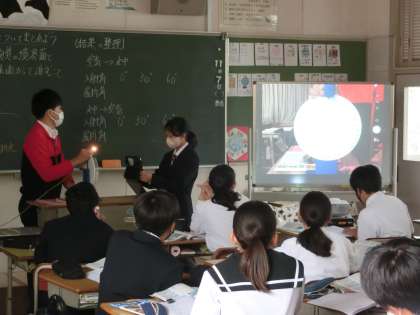 「光の屈折についてまとめよう」をテーマに学習が進められていました。前回のグループごとでの実験結果を踏まえ、今回は入射角と屈折角に関する実験が行われていました。全員が結果をしっかり理解できるよう、生徒と教科担任が協力して実験を進めていました。