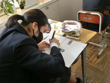 「比例のグラフをかこう」をテーマに学習が進められていました。表に書かれた数字をもとに座標点を確認していきます。細かな活動になるため、全員が集中して取り組んでいました。
