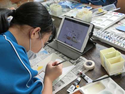 理想の空間の作品づくりで、最終工程の色付け作業です。タブレット内で考えた配色(イメージ画)に従い、マスキングテープを使ったりして丁寧に塗っていきます。無心になって取り組む時間です。