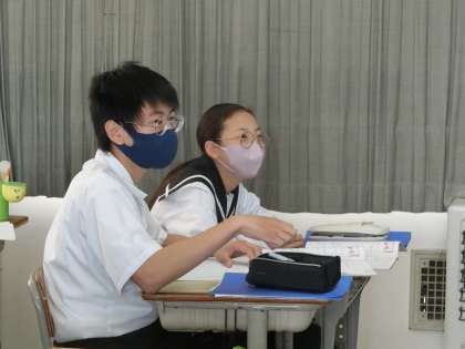 「錯角・同位角」について学んでいました。導き出した答えの解き方や理由をスクリーンを使って説明したり、仲間に身振り手振りで必死に伝えたりしています。その一生懸命さが伝わったのか、自然と拍手が沸き起こる場面もありました。
