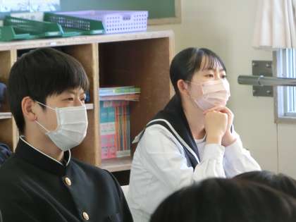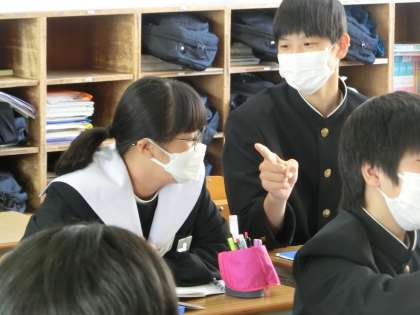 「錯角・同位角」について学んでいました。導き出した答えの解き方や理由をスクリーンを使って説明したり、仲間に身振り手振りで必死に伝えたりしています。その一生懸命さが伝わったのか、自然と拍手が沸き起こる場面もありました。