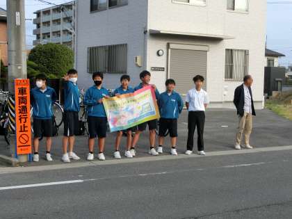 後期が始まってから行われている父母教師会の役員さん方による登校時の立哨活動。今朝はそれに加え、生徒たちも活動に参加してくれました ———。