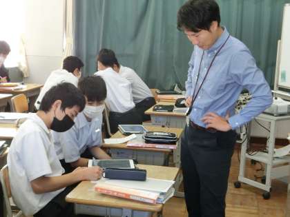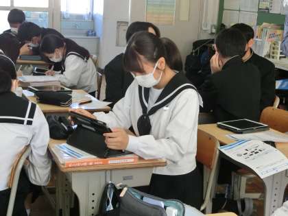 「近未来メッセージアプリ」について、たくさんのアイデアを考えていました。現在のメッセージアプリの改善案とその説明をプリントに書き込んでいきます。近い将来、生徒たちのアイデアが現実の世界でも当たり前になることを期待したいと思います。