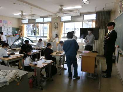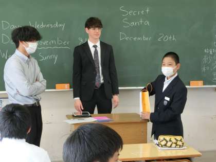 11/9 ワクワク ドキドキ 1 公開日 2023/11/09 更新日 2023/11/09 各学年から 1,2学級の英語の授業の様子です。 ALTさんのアイデアで、「先生たちにクリスマスプレゼントを贈ろう」と題したサプライズ企画が動き出しました。今回の授業では、誰に贈るかを決めるため、先生たちの名前の書かれた短冊を引き当てていきます。ワクワク・ドキドキしながら短冊を引いていきます。大きな歓声が上がる場面もありました。 プレゼントの内容は、お楽しみということで…。