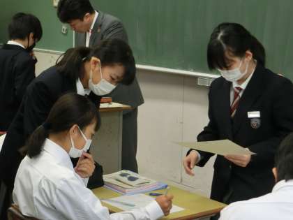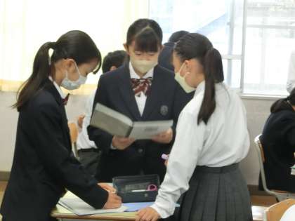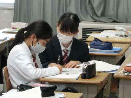 「比例のグラフをかこう」をテーマに学習が進められていました。仲間と教え合ったり、教科担任に正答を確認しに行ったりしていました。よく見ていると、さっきまで教えてもらっていた生徒が、今度は教える側になっている場面も見かけました。