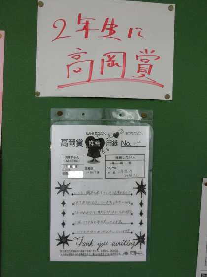 そんな中、3年生のある生徒が2年生全員に対して高岡賞を贈っていました。内容は、次のとおりです。