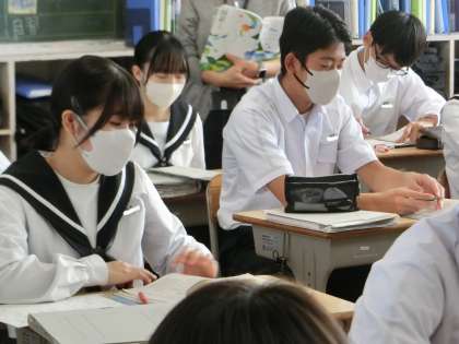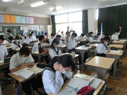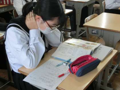 「和歌の世界を楽しもう」の単元で、「三つの歌集について知り、仮名序の音読を楽しもう」をテーマに学習が進められていました。積極的に音読に挑戦する生徒たち。発表後には拍手が自然と沸き起こります。温かく、楽しい雰囲気で授業が進められていました。