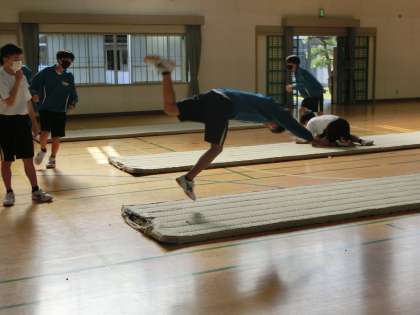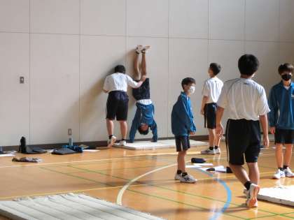 力試しということで、それぞれができる種目の確認をしていました。グループ内でアドバイスをしようと仲間の様子をよく見ています。今後練習を積んで、これまでの自分を超える技能を身につけてほしいと思います。