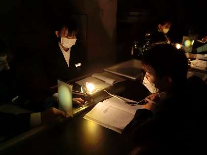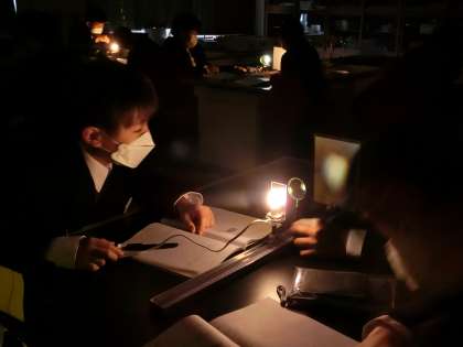「凸レンズと像の位置」について、実験を通して学習していました。より正確な結果を得るため、理科室は真っ暗。少しテンションが上がるかと思いきや、グループで協力してしっかり実験を行っていました。