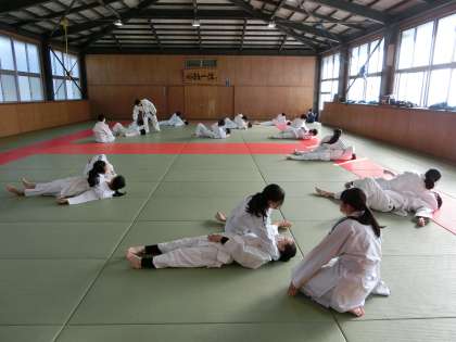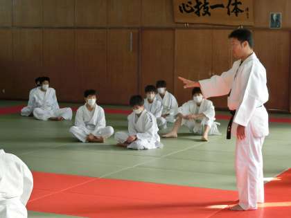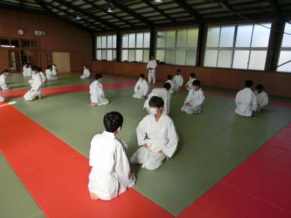 マット運動と並行して柔道にも取り組んでいます。錬成館(=武道場)で安全に柔道の授業を行うために、人数を分けての活動になります。柔道着といういつもと違う格好での活動に、柔道部をはじめ多くの生徒が楽しそうに活動していました。