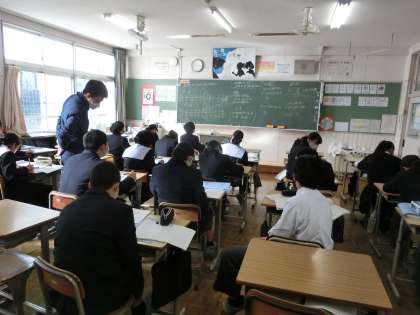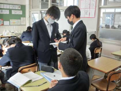 「負の数が入った反比例を考えよう」をテーマに学習が進められていました。まずは表を使って、負の数が入っても反比例の性質が成り立つことをおさえていきます。その後、練習問題を解きながら、仲間と求め方を確認し合っていました。