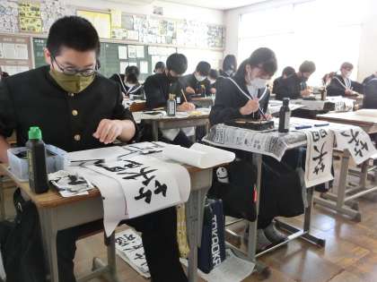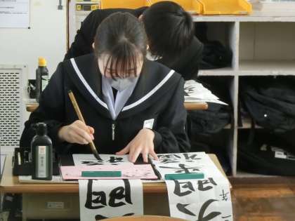 冬休み明けに実施される書き初め大会に向けて練習が始まっていました。2年生のお題は「笑門来福」。今回は櫃脈を意識した練習でした。いつもとはまた違った雰囲気で全員が取り組んでいました。