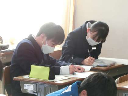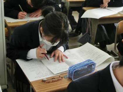 返却された定期テストの解説を聞きながら、間違えてしまった問題、理解が不十分だった問題の解き直しに取り組んでいました。年明けには学習診断テストがあります。正解でなかった問題をしっかりまとめておき、今後の学習に活かしてほしいと思います。