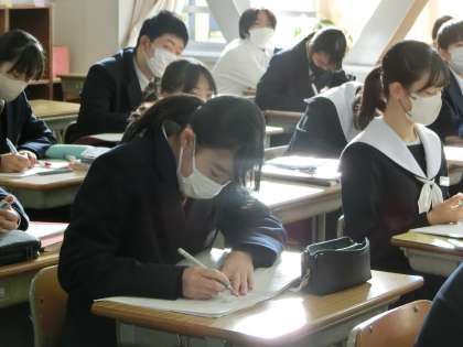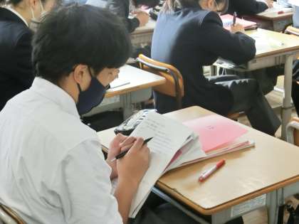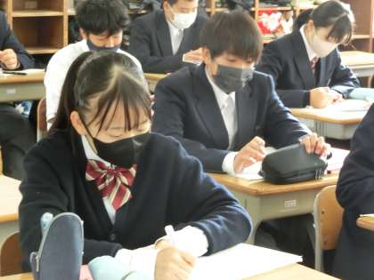 「want to 〜」の文型について学んでいました。to のあとは動詞の原形がくることなどを知り、教科担任の説明を一生懸命聞いたり、プリントにメモしたりしている様子が印象的でした。