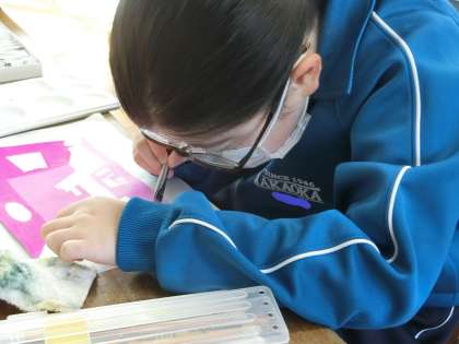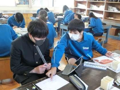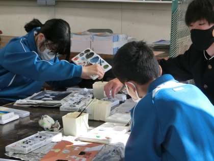 理想の空間の作品づくりで、最終工程の色付け作業です。タブレット内で考えた配色(イメージ画)に従い、マスキングテープを使って丁寧に塗っていきます。無心になって取り組んでいました。