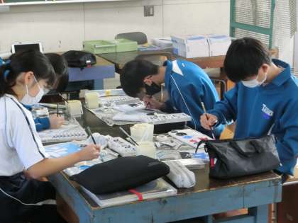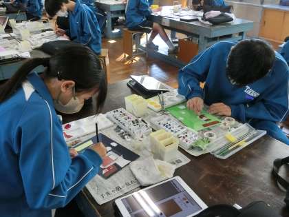 理想の空間の作品づくりで、最終工程の色付け作業です。タブレット内で考えた配色(イメージ画)に従い、マスキングテープを使って丁寧に塗っていきます。無心になって取り組んでいました。