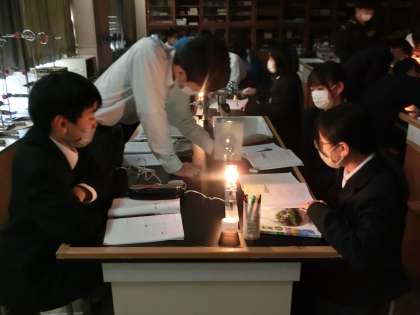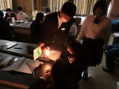 「凸レンズと像の位置」について、実験を通して学習していました。より正確な結果を得るため、理科室は真っ暗。少しテンションが上がるかと思いきや、グループで協力してしっかり実験を行っていました。