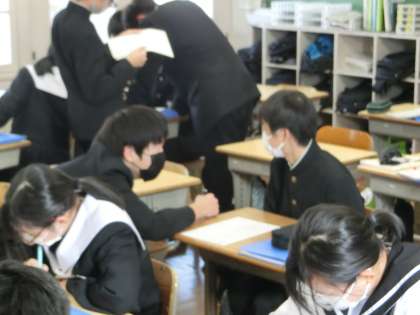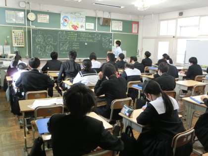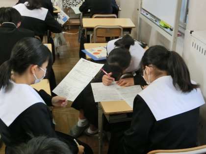 「円周角の定理の逆を考えよう」をテーマに学習が進められていました。これまでは、円内にかかれた図形の角度を円周角の定理を使って解いていましたが、今回は、円がかかれていなくても条件がそろえば円周角の定理が使えるという問題に挑戦していました。次第に難易度の上がる問題ですが、解けたときの喜びはとても大きいようです。