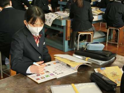 「シンボルネーム」という作品づくりに向け、配色バランスを考えていました。自分のイメージに合ったベースとなる色合いにどんな色を合わせていくとよい作品になるかを考えていきます。完成した作品を想像しながら、一生懸命考えていました。