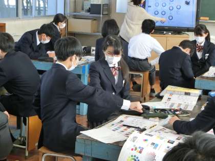 11/27 1-5 自分に合った配色は… 3 公開日 2023/11/27 更新日 2023/11/27 各学年から 1年5組の美術の授業の様子です。 「シンボルネーム」という作品づくりに向け、配色バランスを考えていました。自分のイメージに合ったベースとなる色合いにどんな色を合わせていくとよい作品になるかを考えていきます。完成した作品を想像しながら、一生懸命考えていました。