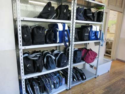 教室のロッカーでは日ごろ使っているカバンが入り切らないのが現状です。この問題を解決するため、本校では各教室の廊下に棚が用意され、大きなカバンや部活動の用品、美術のデザインセットなどは、ここに置くようにしています。