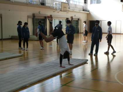 マット運動では、いよいよ練習成果の発表のタイミングが迫ってきており、仲間にアドバイスをもらいながら、一生懸命練習していました。また、柔道では、前回り受け身をマスターしようと何度も挑戦している様子が印象的でした。