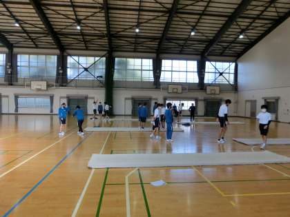 安全面と活動効率を考えて、体育館でマット運動、錬成館で柔道の学習が行われています。