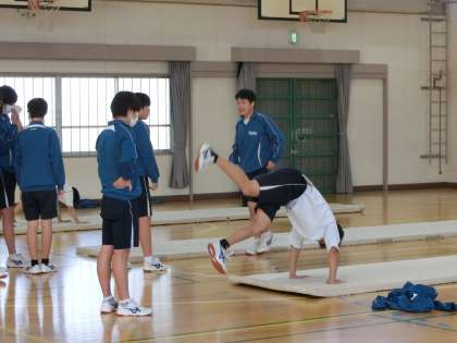 マット運動では、いよいよ練習成果の発表のタイミングが迫ってきており、仲間にアドバイスをもらいながら、一生懸命練習していました。また、柔道では、前回り受け身をマスターしようと何度も挑戦している様子が印象的でした。