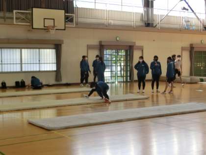 安全面と活動効率を考えて、体育館でマット運動、錬成館で柔道の学習が行われています。