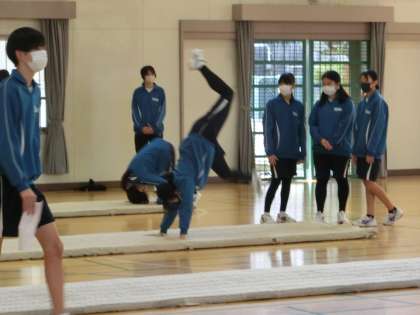 安全面と活動効率を考えて、体育館でマット運動、錬成館で柔道の学習が行われています。