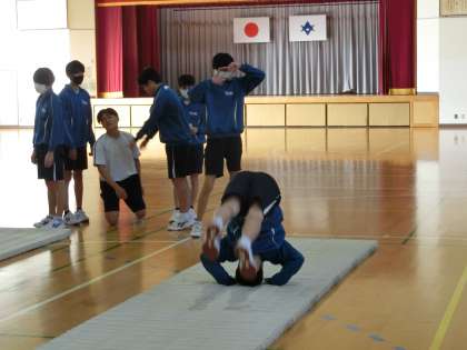 マット運動では、いよいよ練習成果の発表のタイミングが迫ってきており、仲間にアドバイスをもらいながら、一生懸命練習していました。また、柔道では、前回り受け身をマスターしようと何度も挑戦している様子が印象的でした。