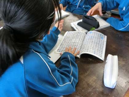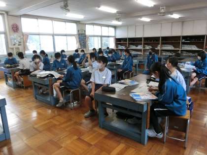 シンボルネームの作品づくりに向け、「使う文字をレタリングしてみよう」をテーマに活動が進められていました。明朝体やゴシック体など、自分のイメージに合った書体を選びいくつかの素材をつくっていきます。出来上がりを想像すると、創造意欲がわく瞬間でもあります。