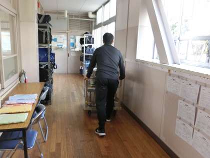 本校の4時間目後半、給食直前の様子です。先生たちが給食のワゴンを各教室前まで移動させています。