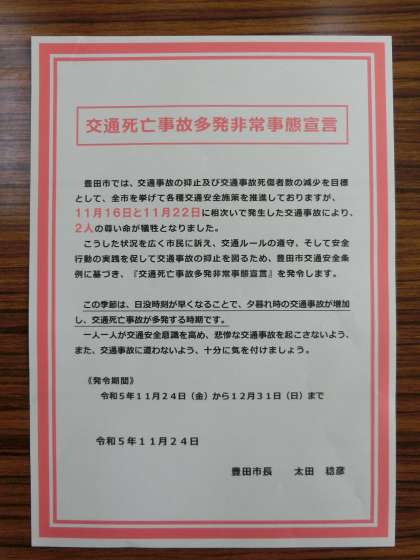 現在、豊田市では、「交通死亡事故多発非常事態宣言」が発令されています。誰もが安全に安心して生活できるよう、お互いに交通安全の意識を高くもちたいものです。