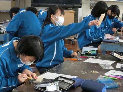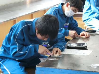 木彫での作品づくりに入るにあたって、「木彫マスターになろう」をテーマに彫刻刀の安全な使い方、様々な彫り方の練習に取り組んでいました。納得のいく作品づくりには、まずはしっかりとした技術も必要です。限られた時間で確実にマスターし、素晴らしい作品づくりに挑戦してほしいと思います。