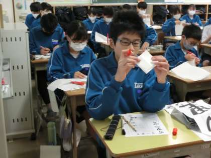本格的な書き初めの練習に入る前に、練習の際のポイントを確認したり、必要な準備を進めたりしていました。