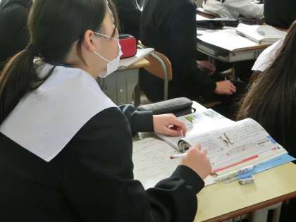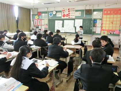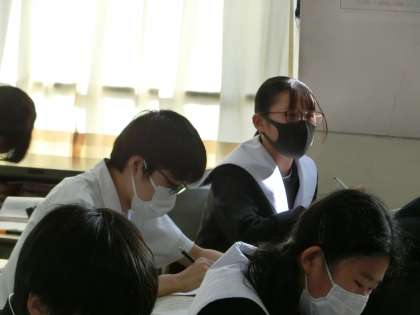 奥の細道の学習で、「作者の『旅』に対する思いを読み取ろう」をテーマに学習が進められていました。グループででまとめたものの発表を終え、教科担任の解説を聞きながら、まとめた内容を確認していました。