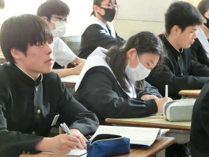 奥の細道の学習で、「作者の『旅』に対する思いを読み取ろう」をテーマに学習が進められていました。グループででまとめたものの発表を終え、教科担任の解説を聞きながら、まとめた内容を確認していました。