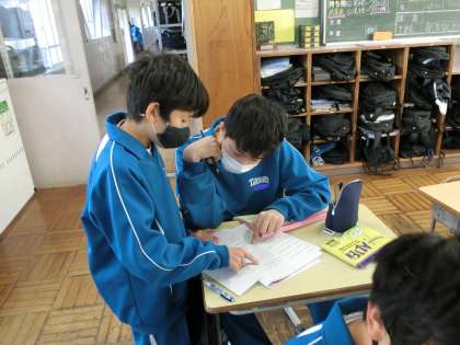 「不定詞」について学習を進めていました。教科担任から配られたプリントをノートに貼るや否や、どんどん進めていきます。分からなくてすぐに聞くのではなく、一度自分の考えをもって不安であれば仲間に確認するという流れで学習していました。