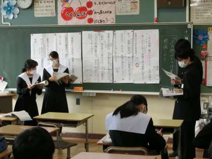 奥の細道の学習で、「作者の思いを想像しよう」をテーマに学習が進められていました。グループでまとめた作者の思いを発表していきます。解釈はさまざまですが、仲間の発表を聞きながら自分たちのグループとの考え方の違いを一生懸命理解しようとしていました。