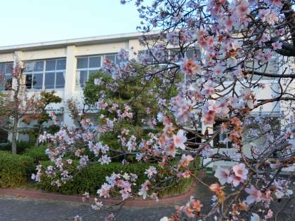 今の学校の風景とは思えない写真ですが…。まぎれもなく今朝の景色です。桜の花もさぞ困惑していることでしょう。レアな風景に出会え、なんだか得した気分になりますね。