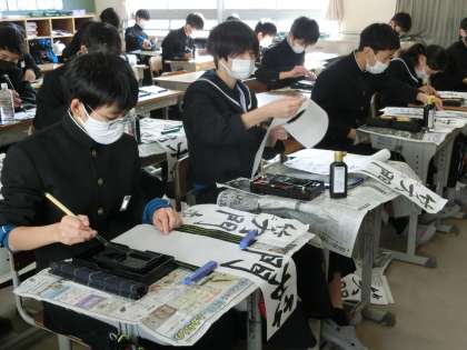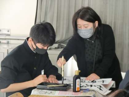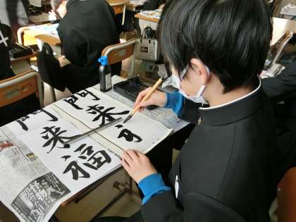 2年5組の国語の授業の様子です。書道ボランティアの方をお迎えして、書き初め上達の極意を教えていただきました。