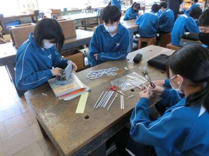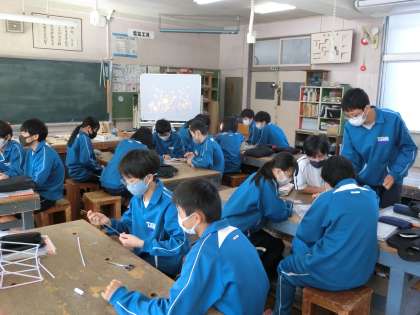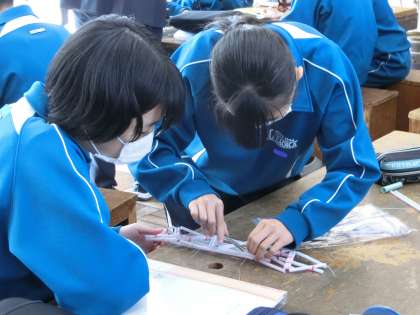 2年2組の技術科の授業の様子です。ストローだけで作成した橋の強度を高めるため、仲間と知恵を出し合い、試行錯誤を繰り返しながら活動に取り組んでいました。