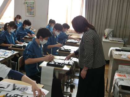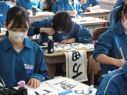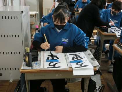 1年2組の国語の授業の様子です。書道ボランティアの方をお迎えして、書き初め上達の極意を教えていただきました。