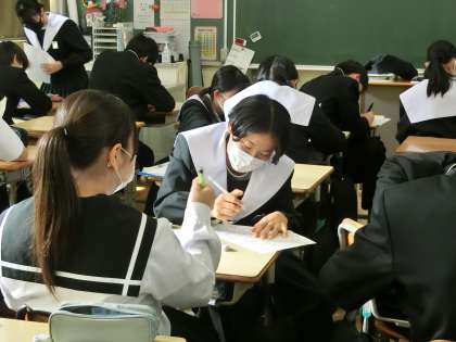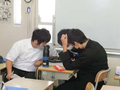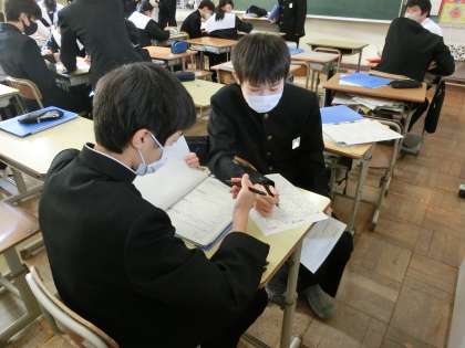 3年2組の数学の授業の様子です。円周角のまとめとして難易度の高い問題に仲間と競い合うように一生懸命取り組んでいました。