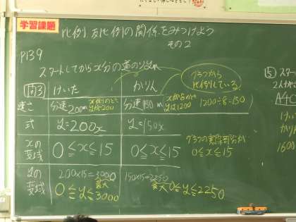 1年5組の数学の授業の様子です。「比例・反比例の関係を見つけよう」をテーマに、文章題の解き方について詳しく学んでいました。