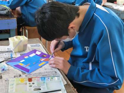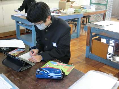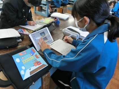 2年1組の美術の授業の様子です。「理想の空間」の作品が続々と完成していました。学習用タブレットとにアップされた仲間の作品を見ながら、鑑賞カードのコメントを記入していきます。